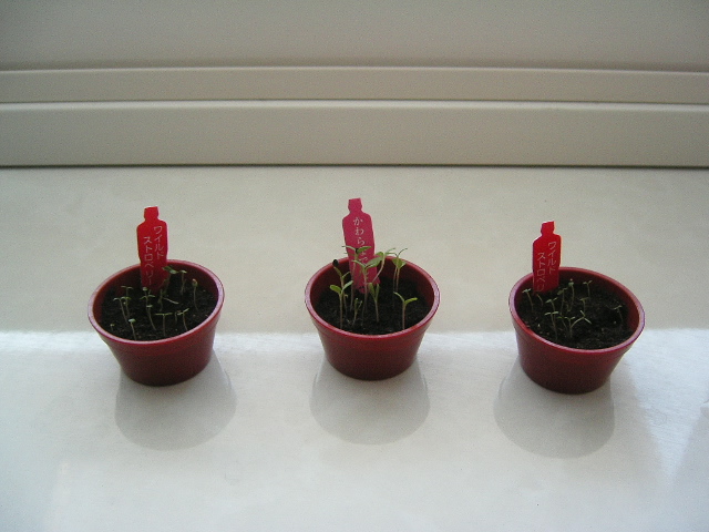両脇が「ワイルドストロベリー」まんなかが「かわらなでしこ」。