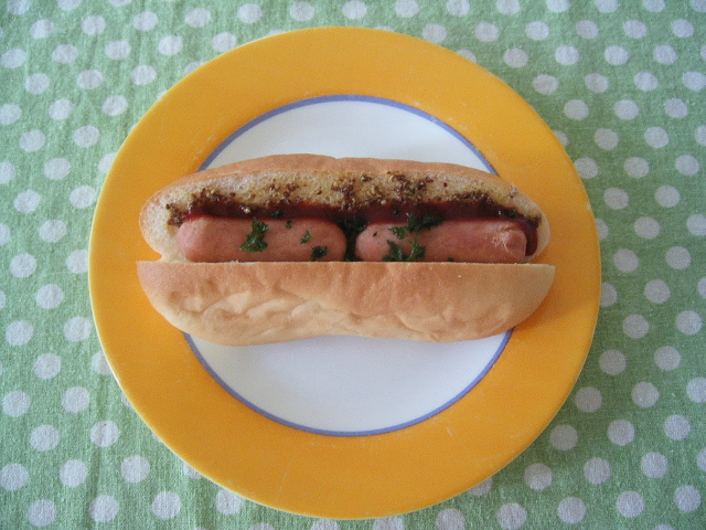 ウインナーとマスタード、ケチャップをたっぷりはさんでホットドック☆