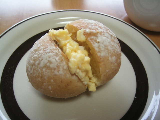 スクランブルエッグを挟んで朝食にしました。